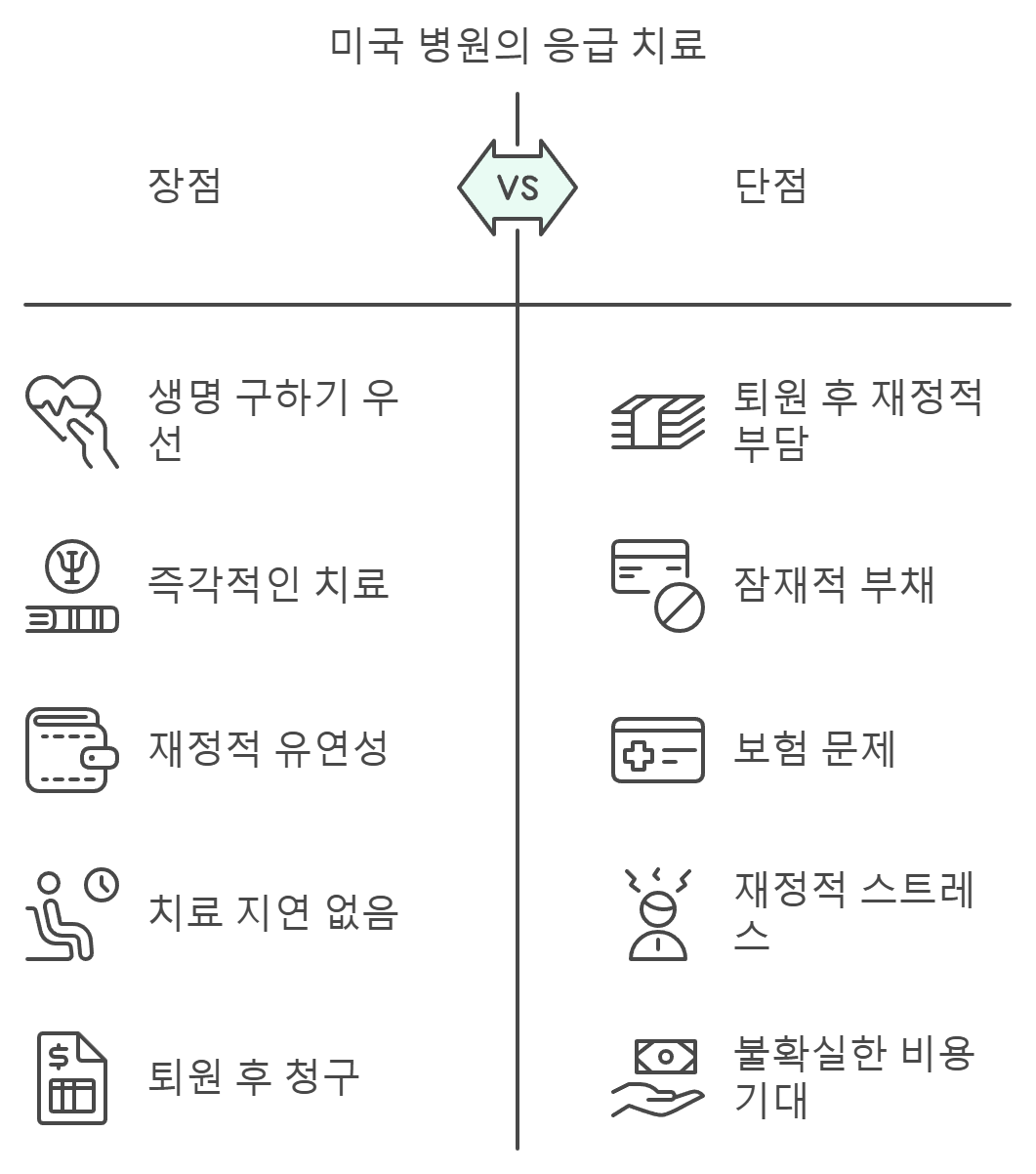미국 병원은 응급 상황에서 환자의 생명을 구하는 것을 최우선으로 삼습니다. 응급실에 오시는 분들에게 치료를 시작할 때 “지갑을 먼저 열어야 한다”는 식의 접근은 전혀 없습니다. 경제적 형편과 관계없이, 생명이 위급한 상황이라면 병원비가 당장 해결되지 않아도 치료가 진행되죠. 환자가 퇴원하고 나서 청구서가 날아오겠지만, 퇴원 시점에 병원비를 다 내지 않는다고 해서 퇴원을 막는 경우는 없습니다. 퇴원 후에 병원비를 정산해서 청구하는 방식이 일반적이기 때문에, 병원비 문제로 치료가 중단되거나 집에 가지 못하는 일은 벌어지지 않죠.