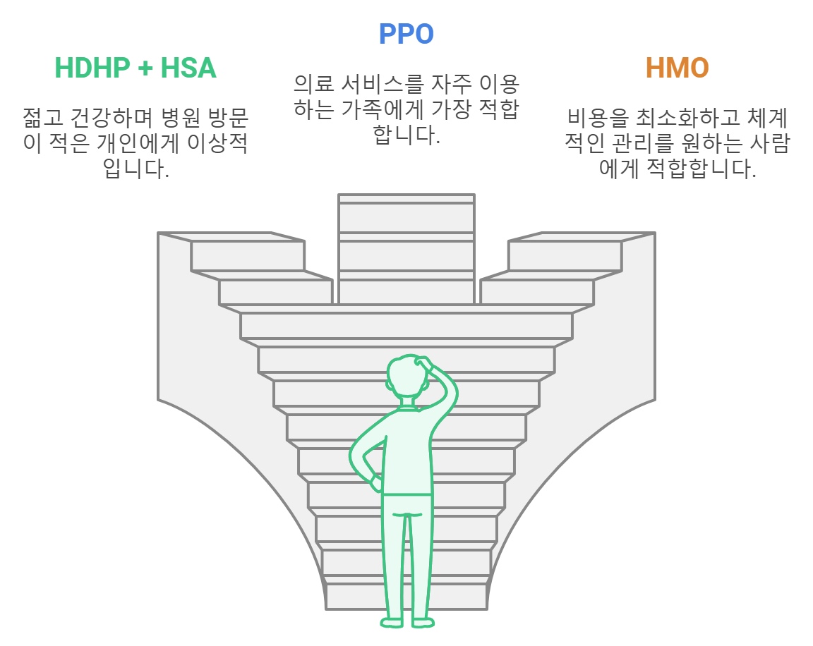 - 의료 이용 패턴: 병원 방문이 잦다면 PPO나 HMO가 더 나을 수 있어요. 병원을 거의 가지 않는다면 HDHP를 고려해 보세요.